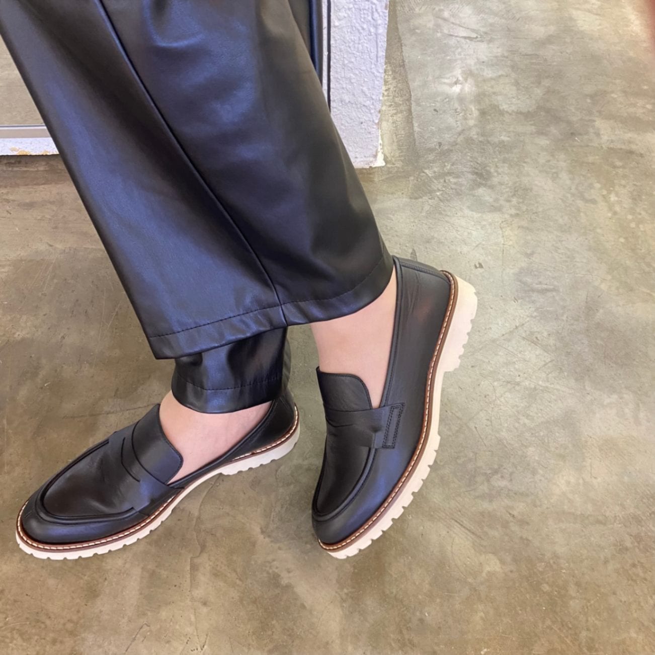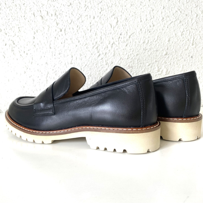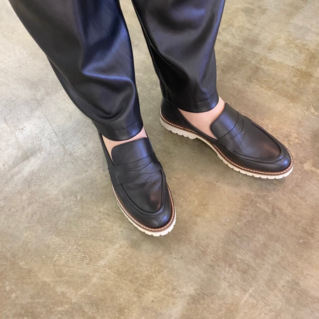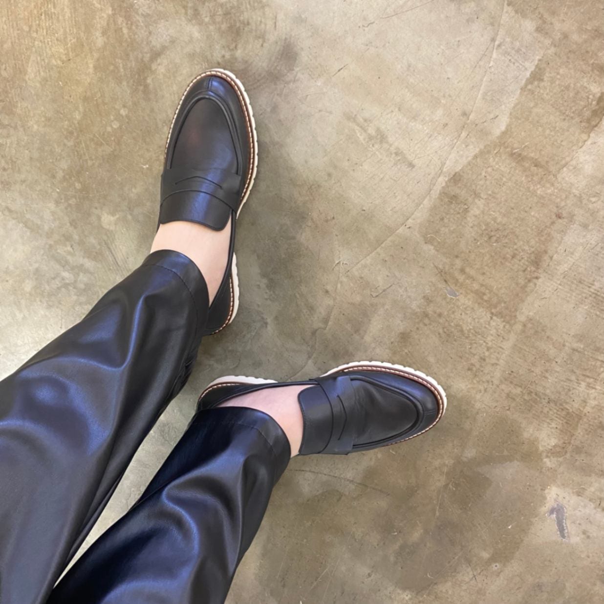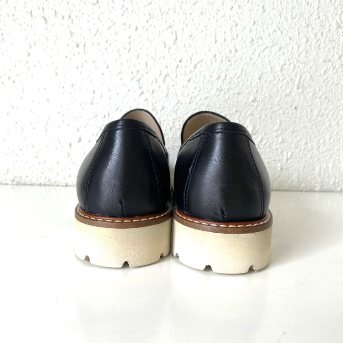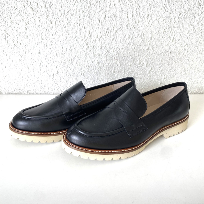 ソールがホワイトなので見た目も軽く見えます。踵にはカウンター(芯)が入っているのでしっかりとホールド感を感じる靴。ソックス合わせや秋冬シーズンにはカラータイツでも履けるシンプルなデザインです。