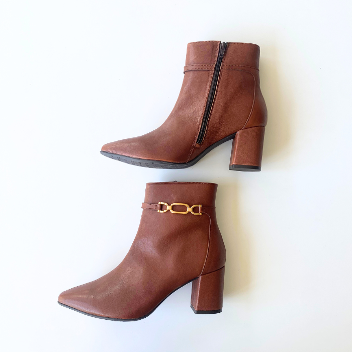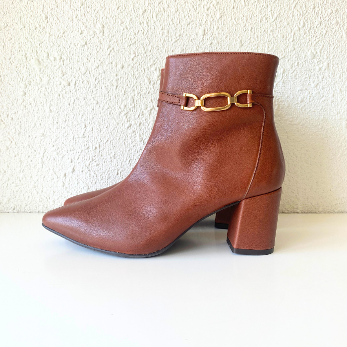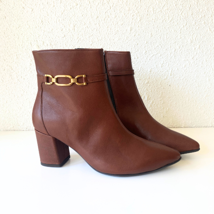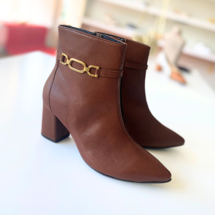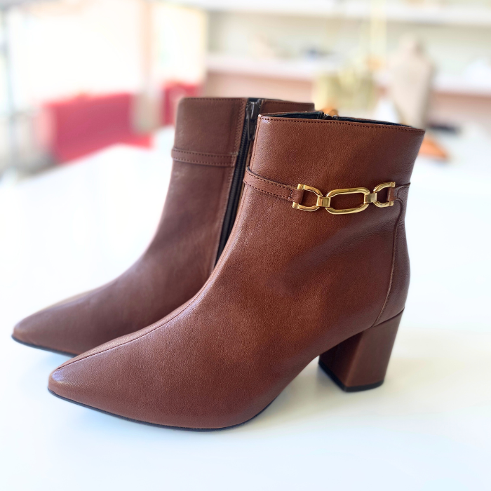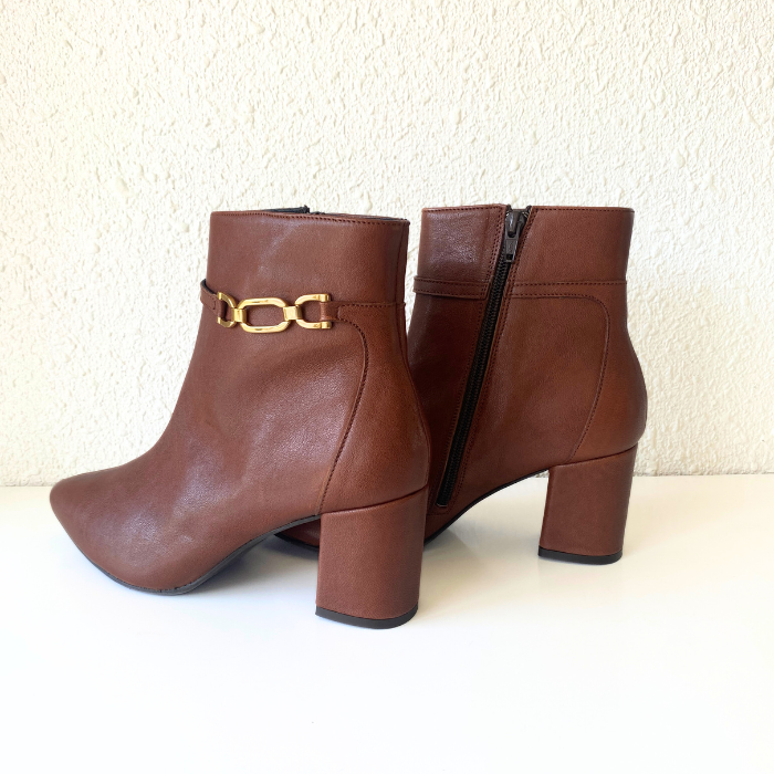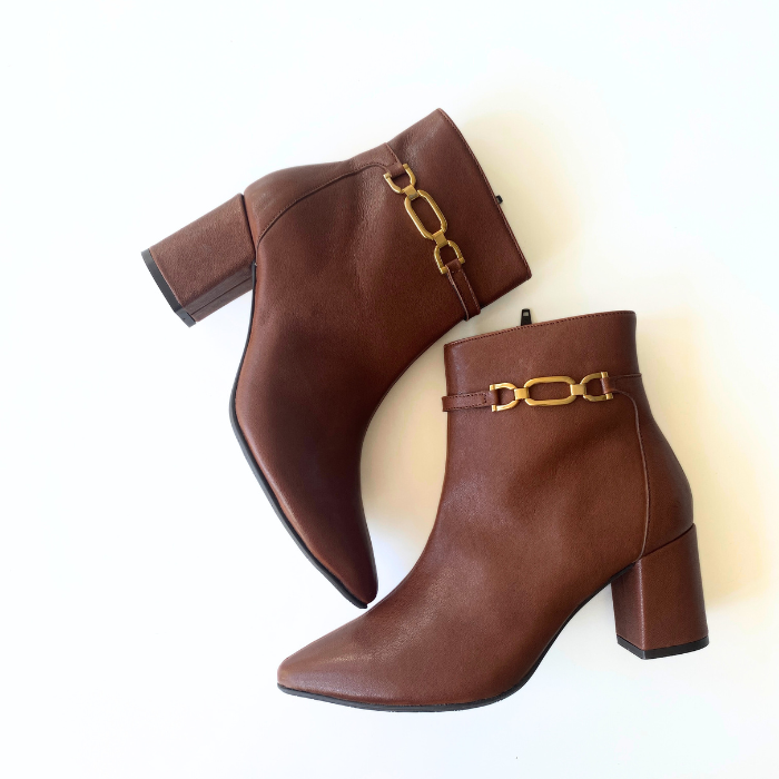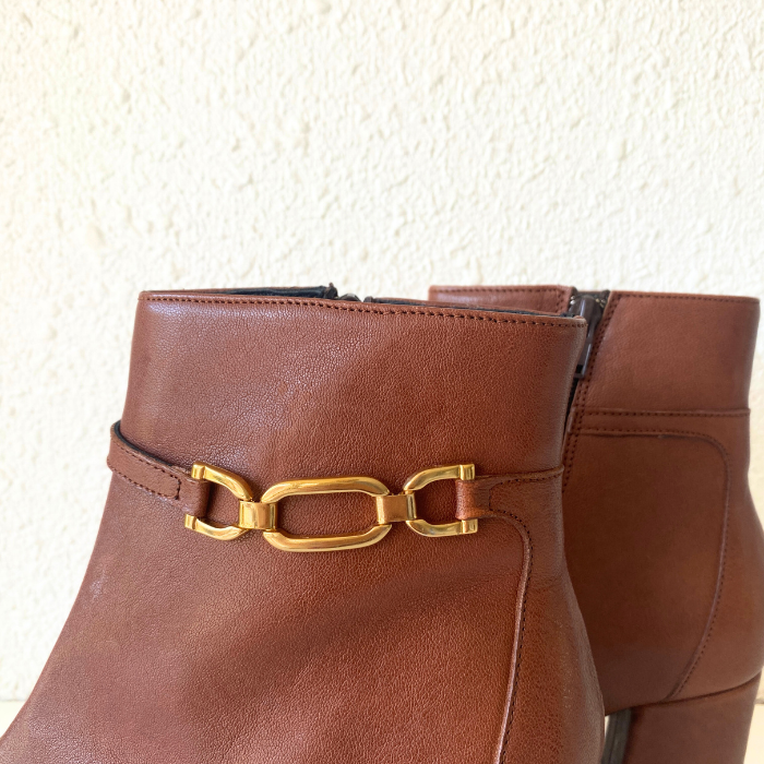ブラウンレザーにゴールドチェーンをあしらった、上品で洗練されたショートブーツ。