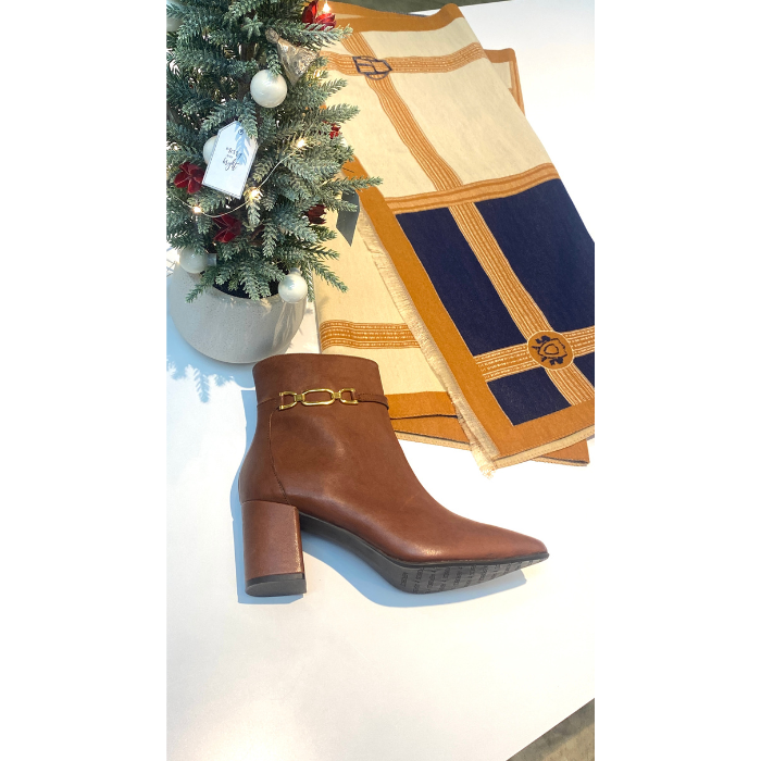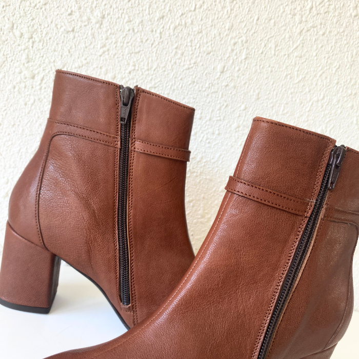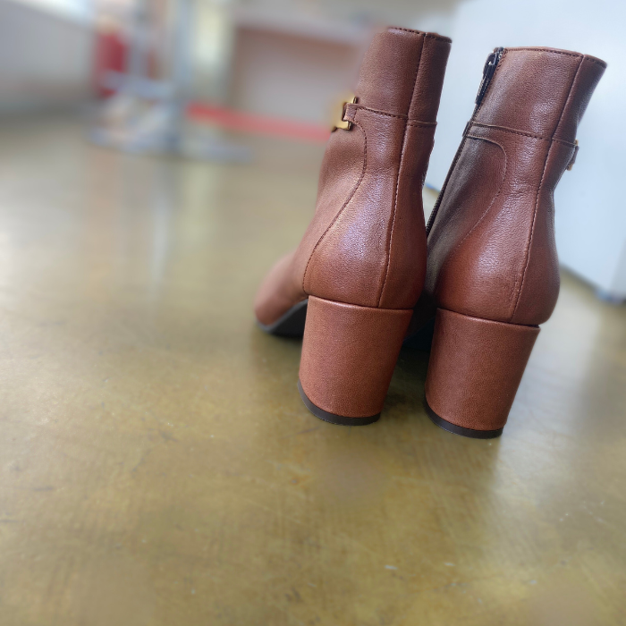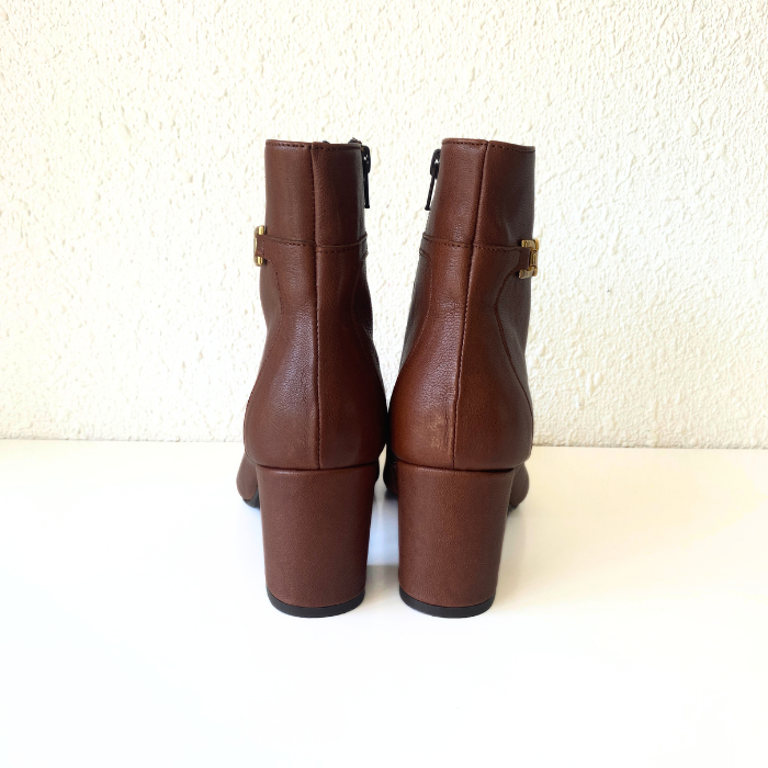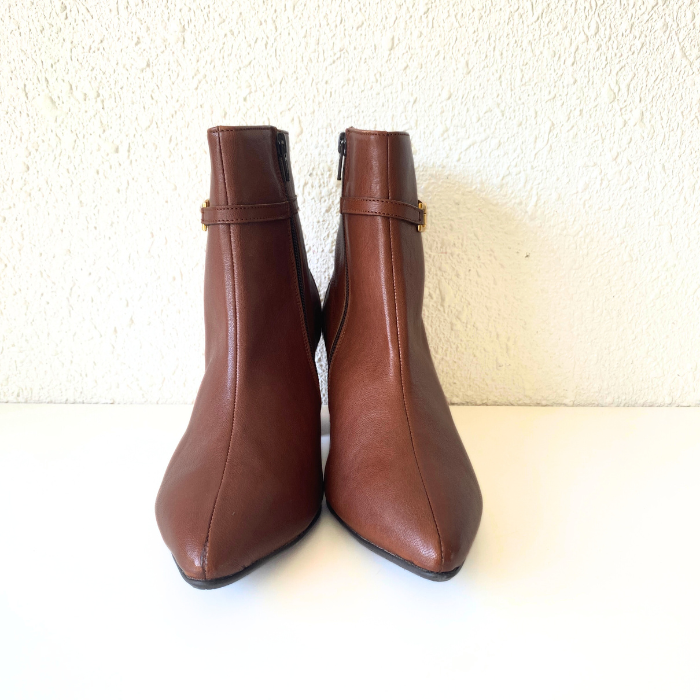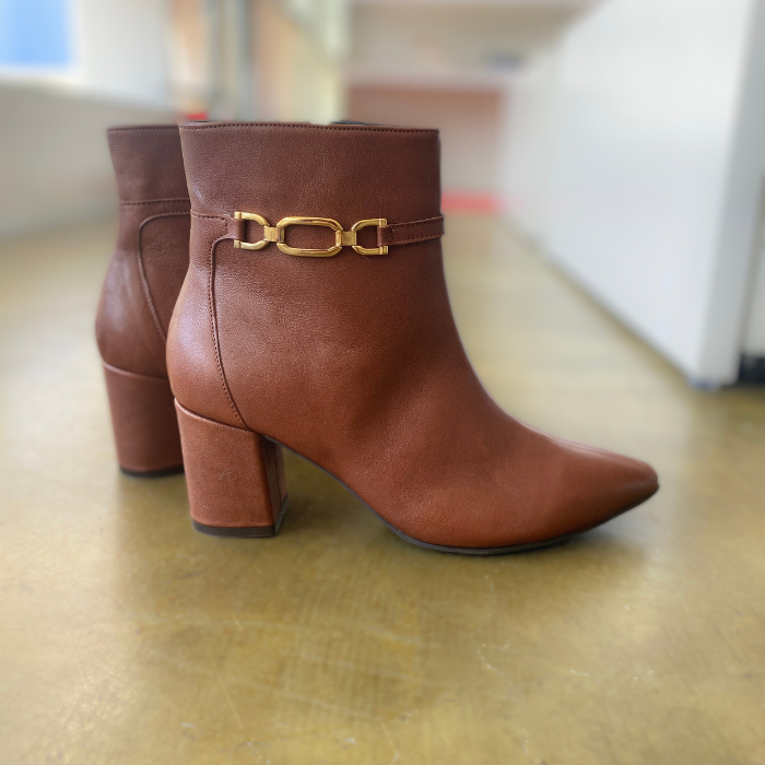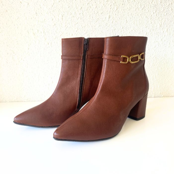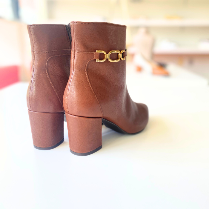 ブラウンレザーにゴールドチェーンをあしらった、上品で洗練されたショートブーツ。