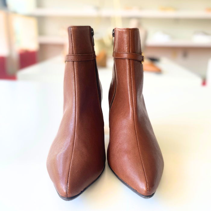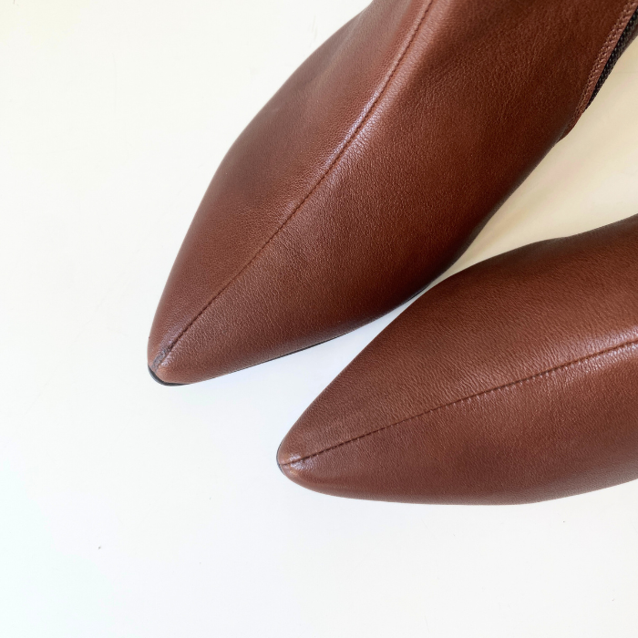 ブロックヒールの安定感とポインテッドトゥの美しいラインが、足元をエレガントに演出します。