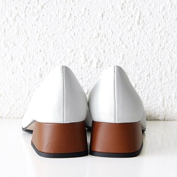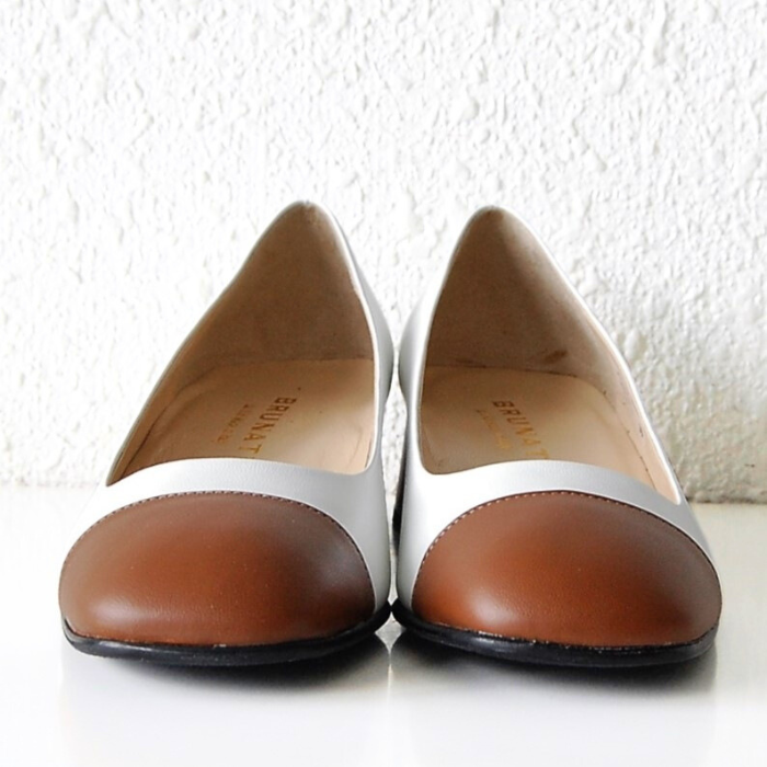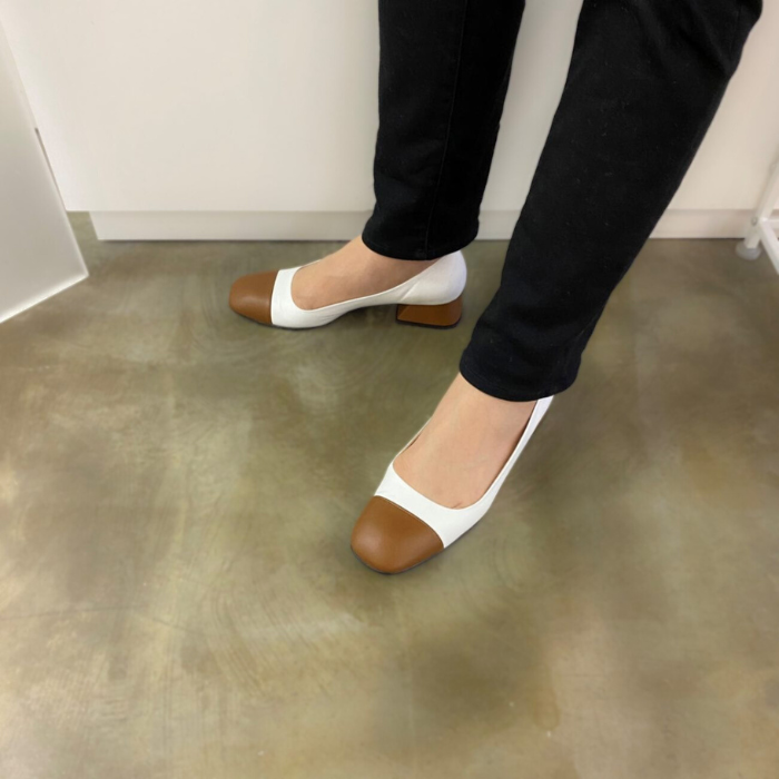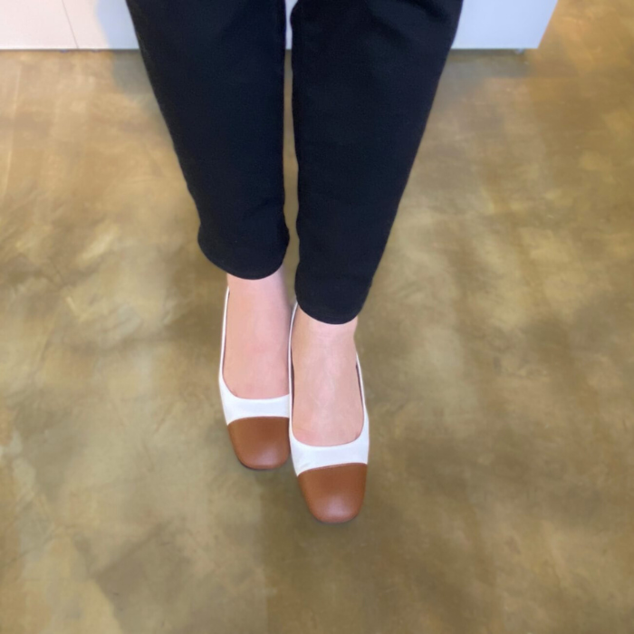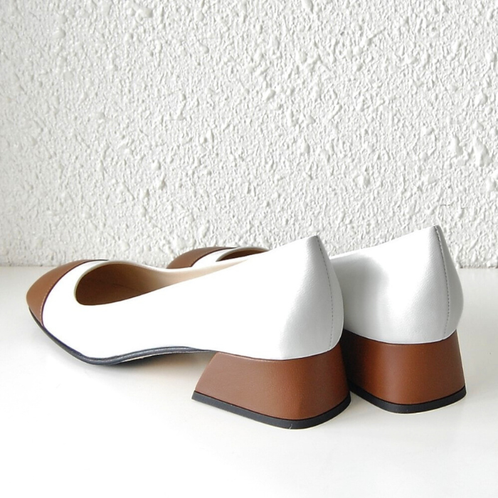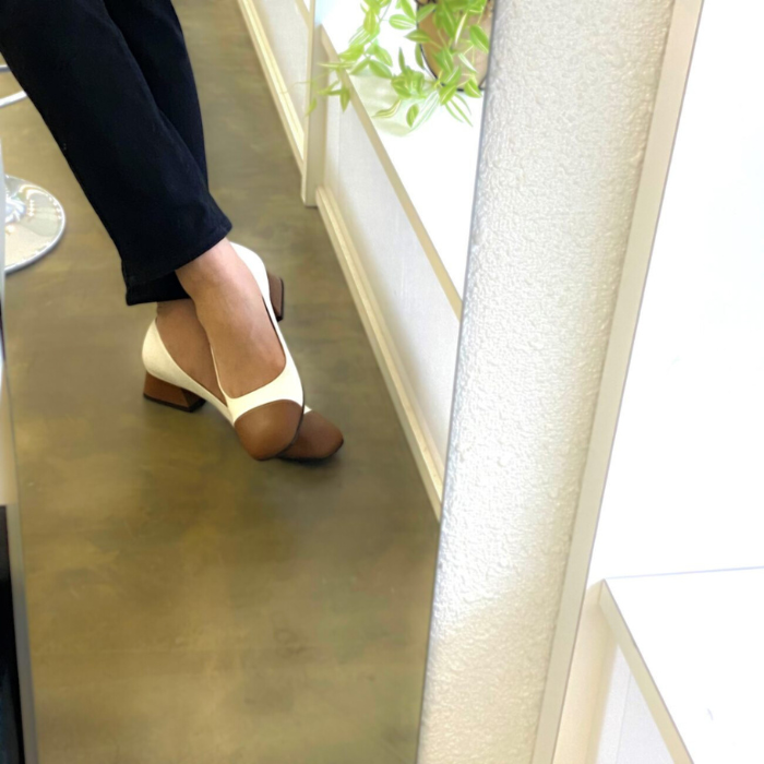 ホワイト×ブラウンのバイカラーパンプス。