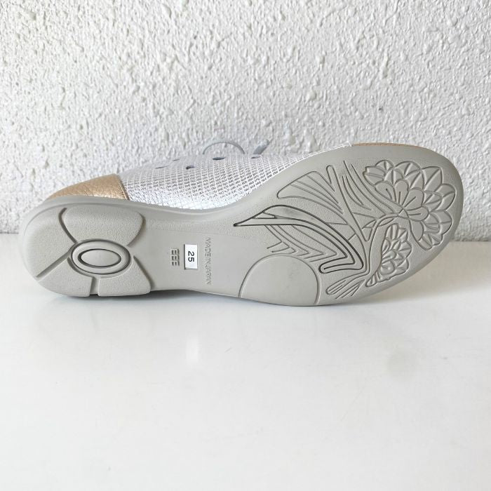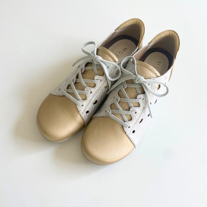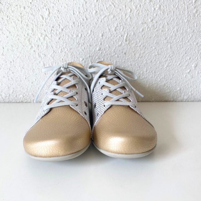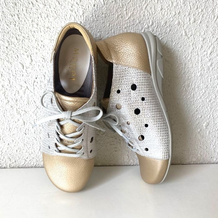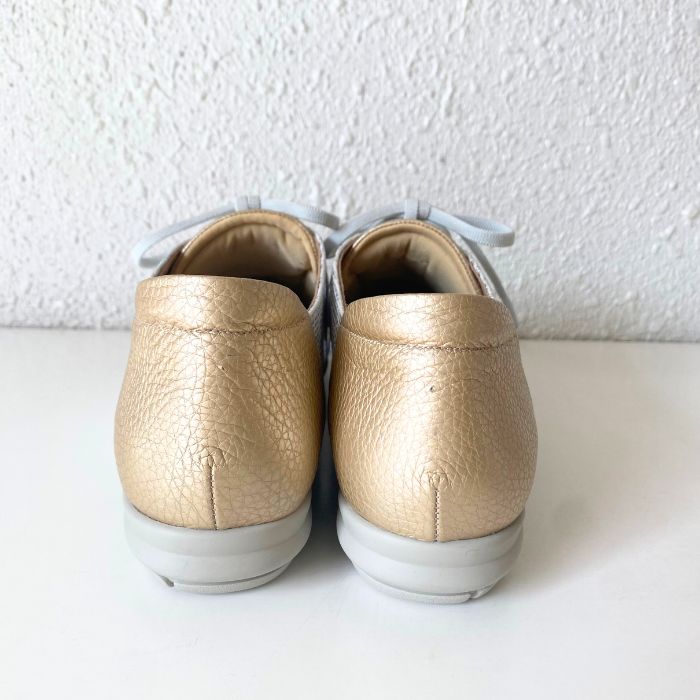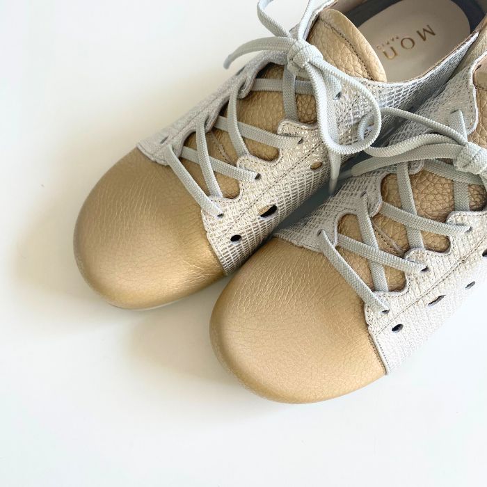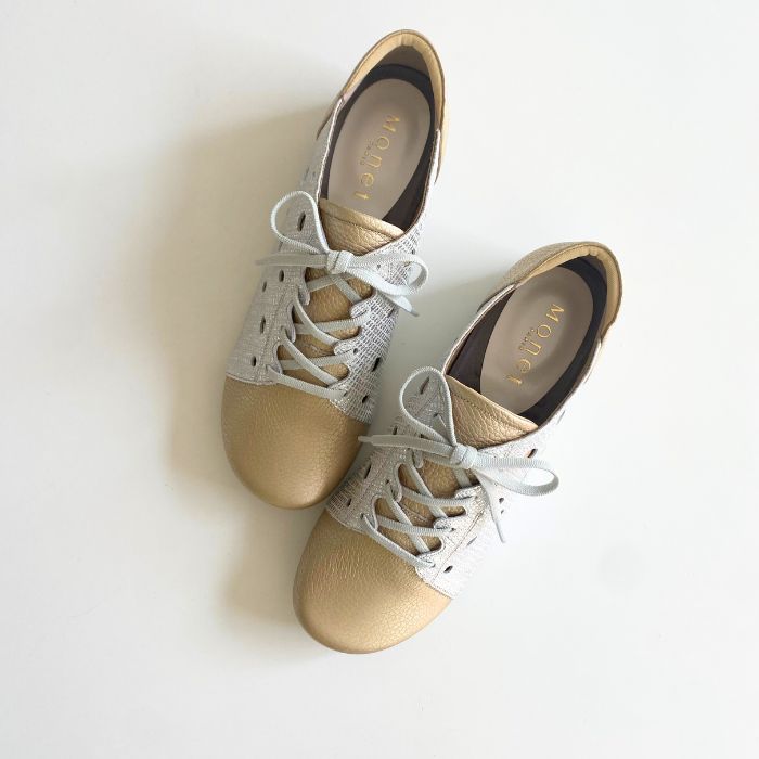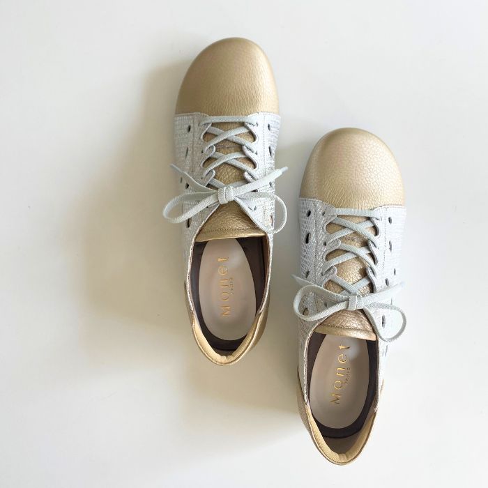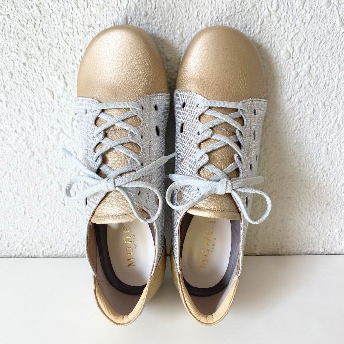 ワイズは3Eで柔らかい牛革、そしてゴム紐なので脱ぎ履きがしやすいのも特徴。