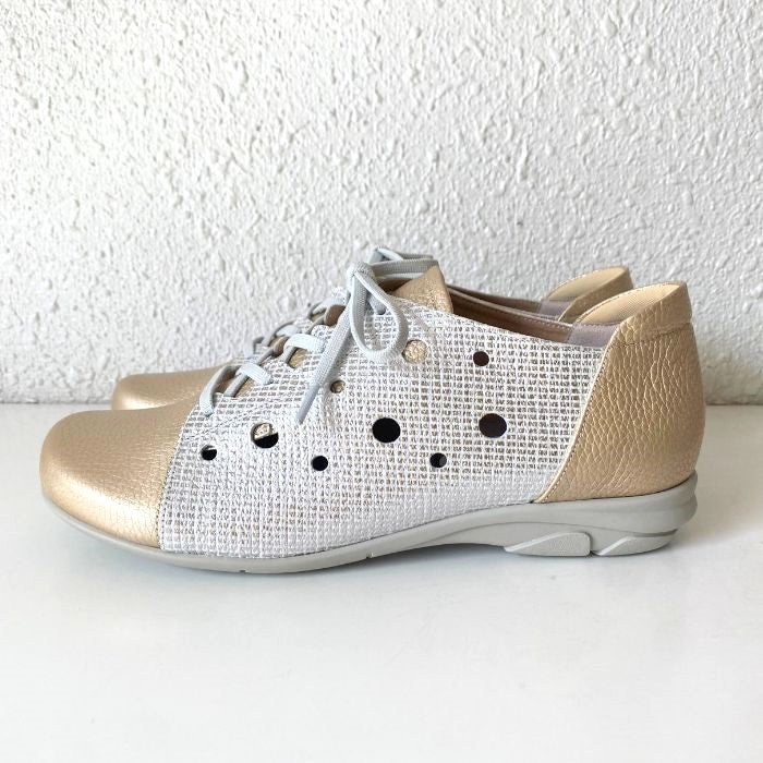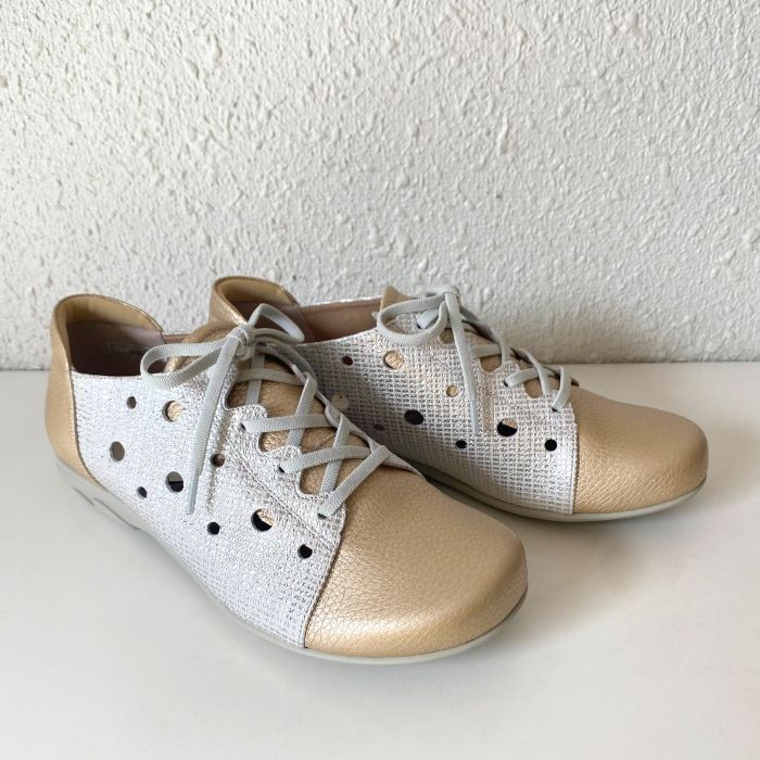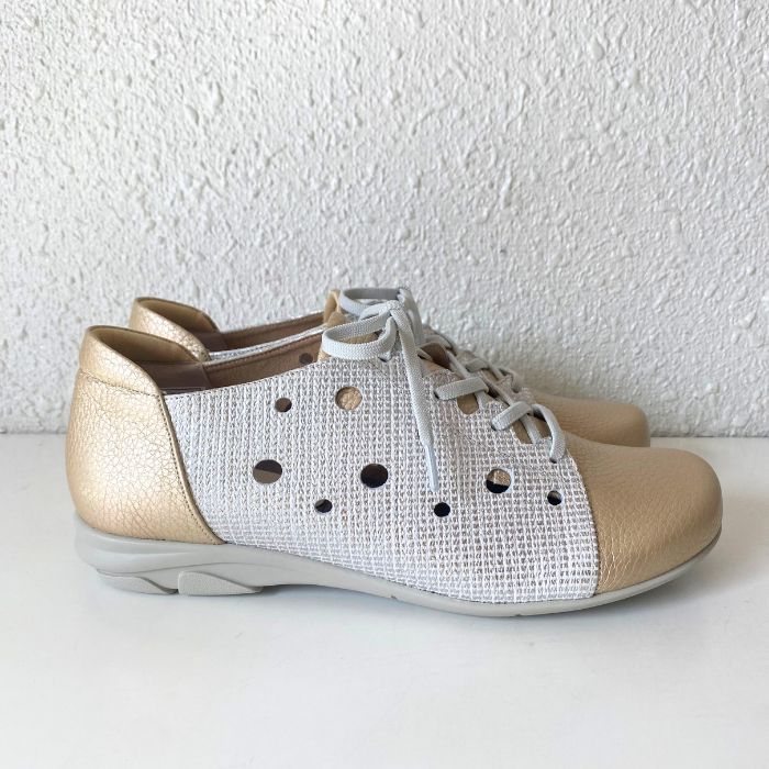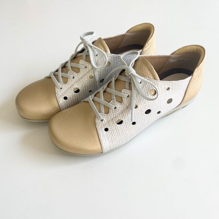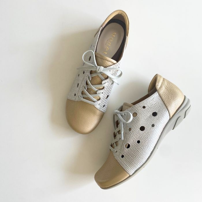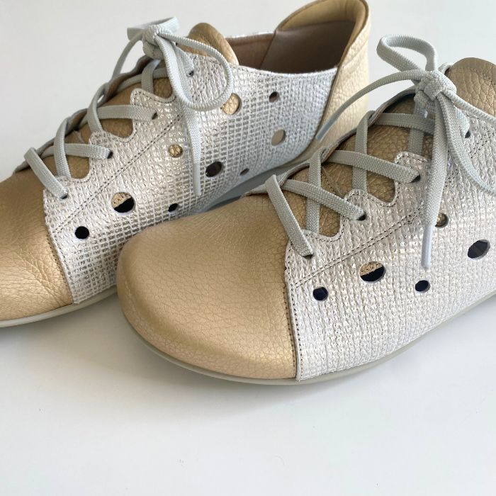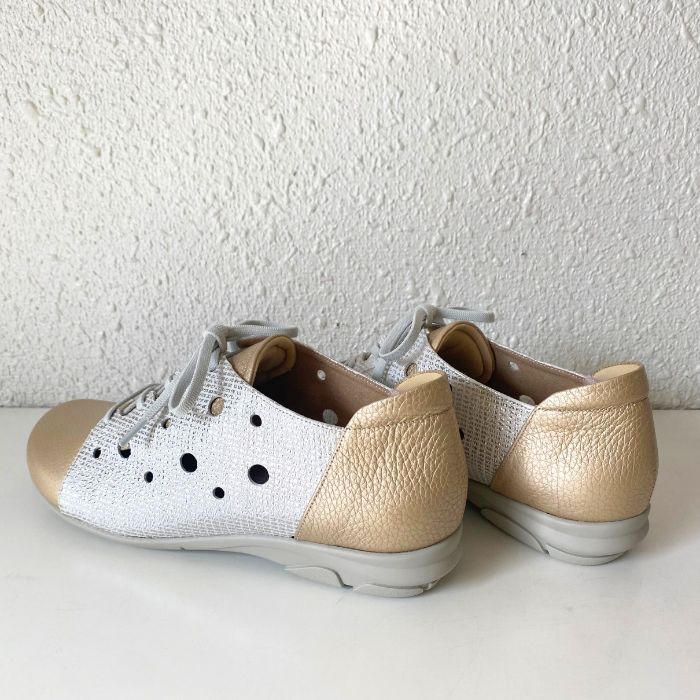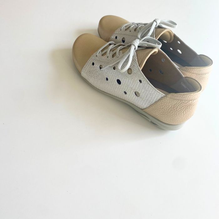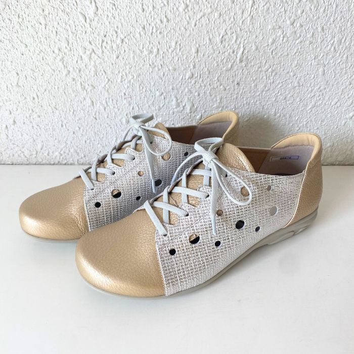 ワイズは3Eで柔らかい牛革、そしてゴム紐なので脱ぎ履きがしやすいのも特徴。