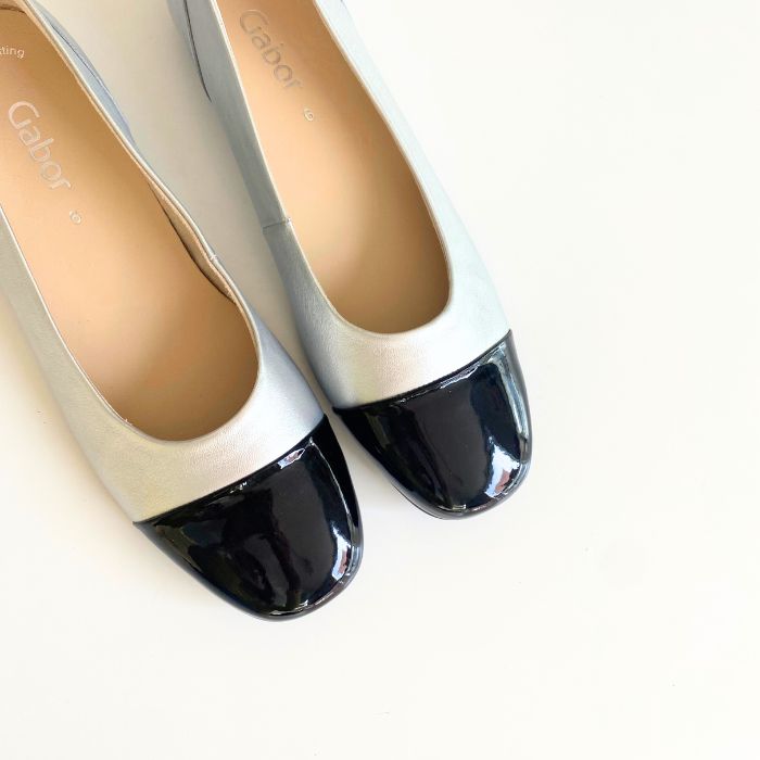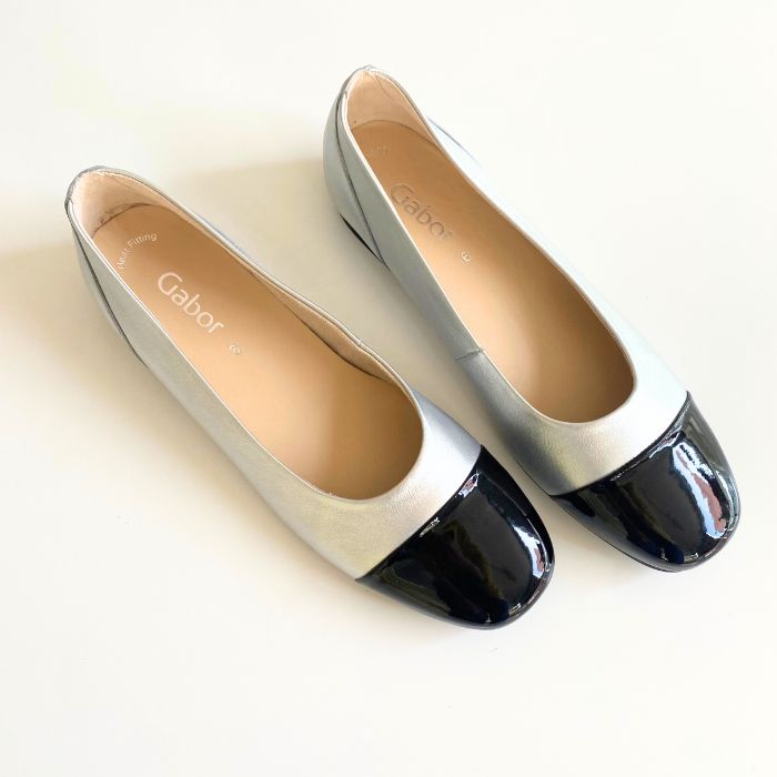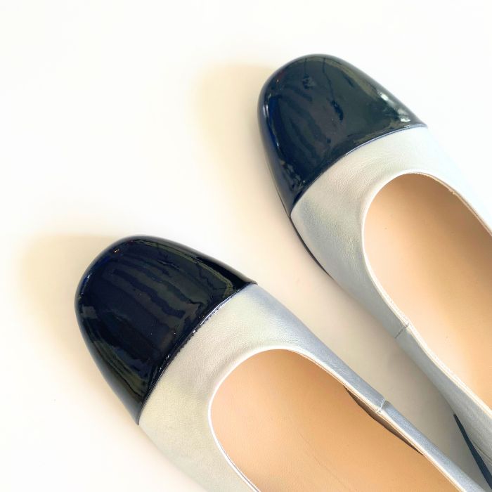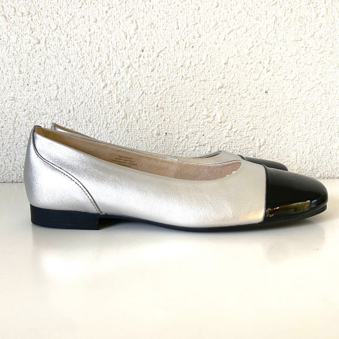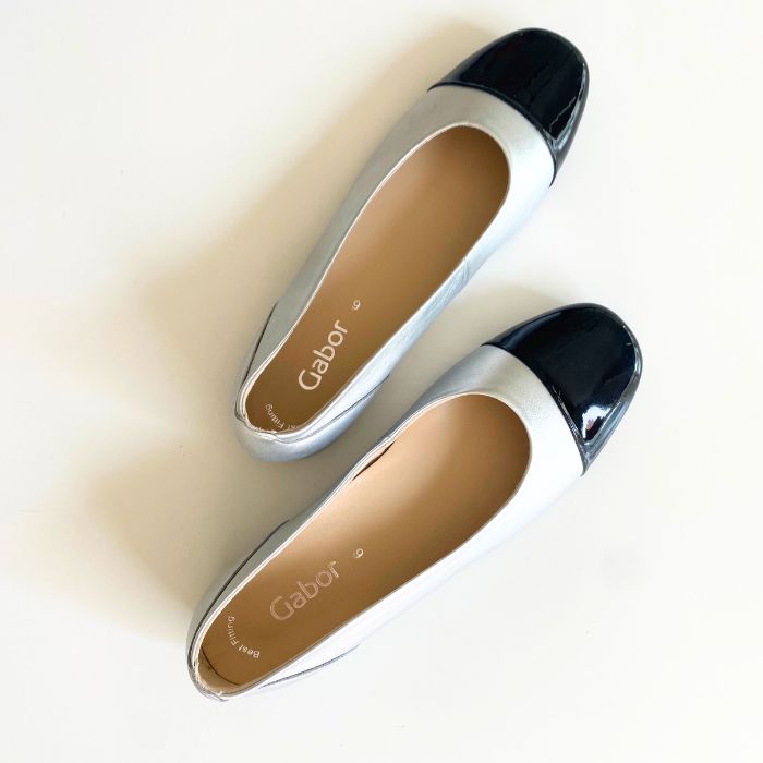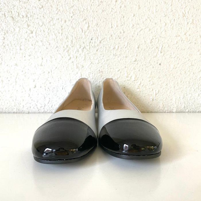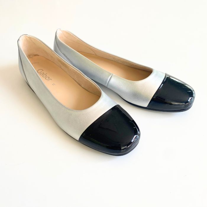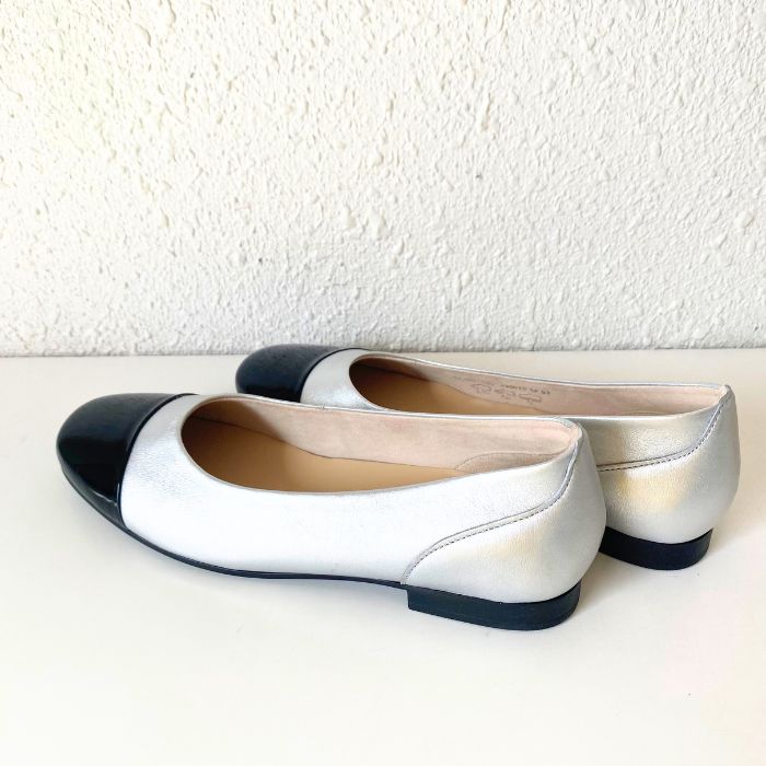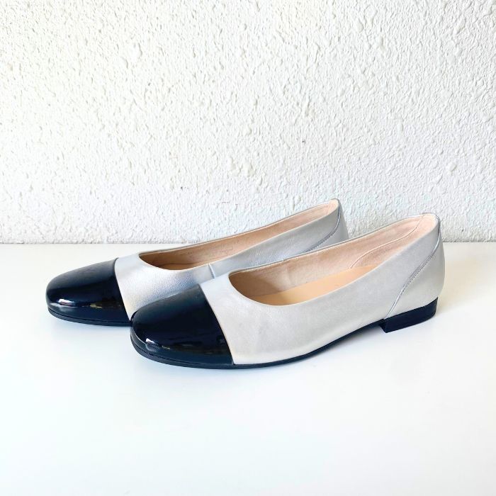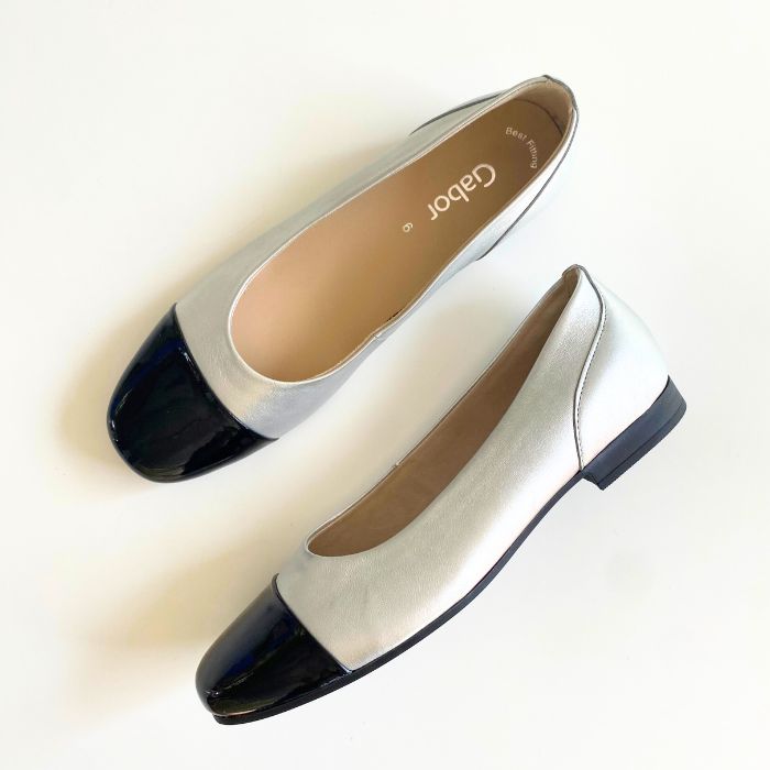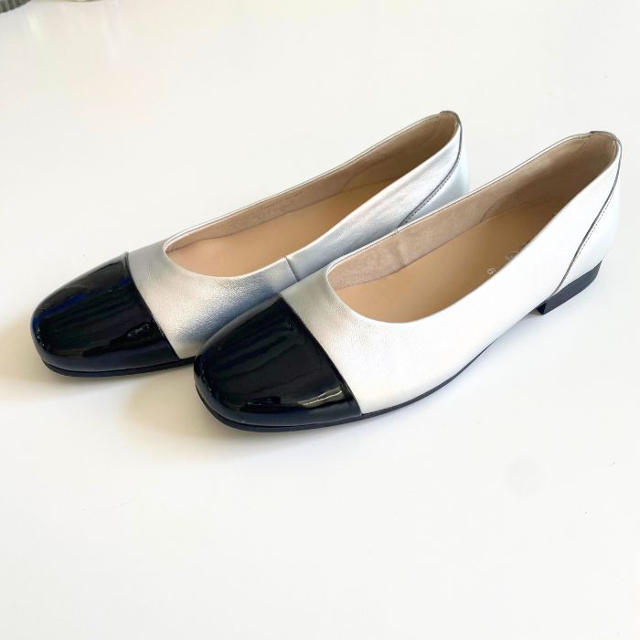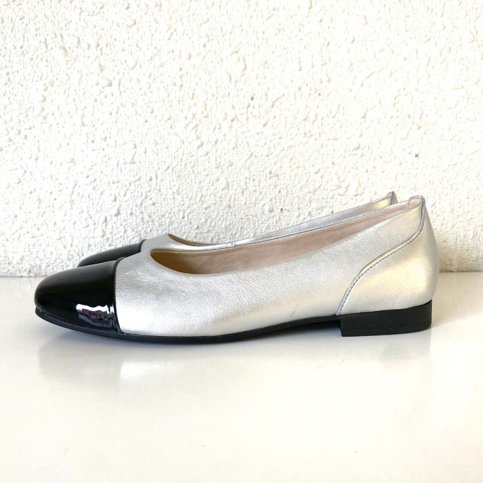 エナメルブラックとシルバーのバイカラーバレエシューズは、暖かくなるシーズンに適した配色。