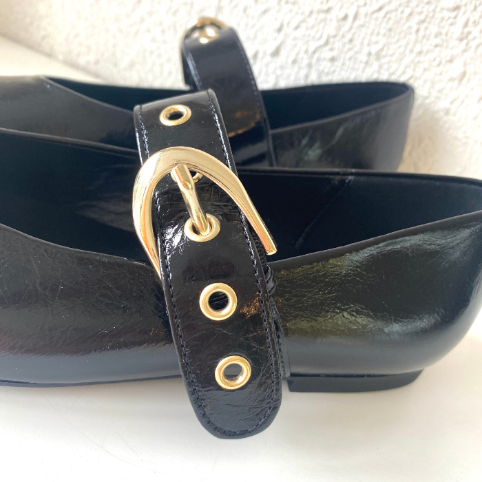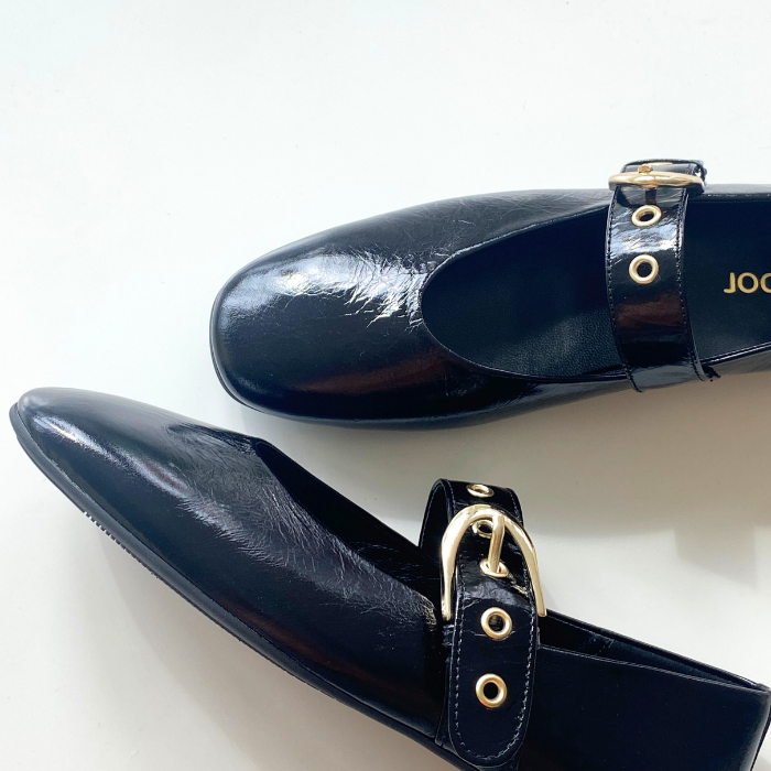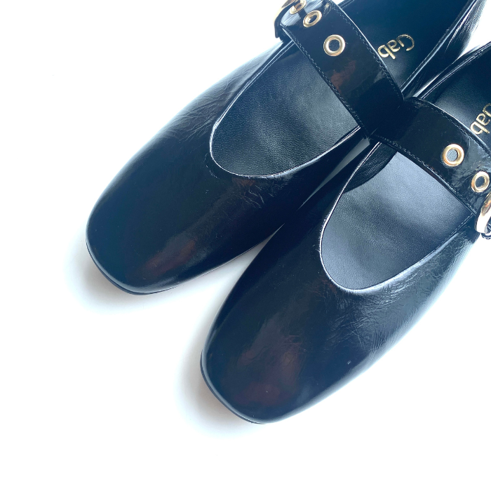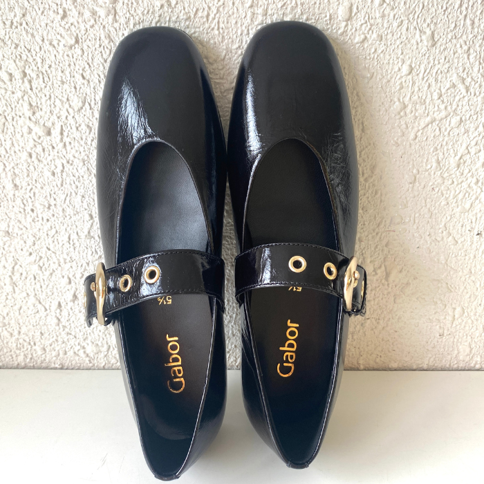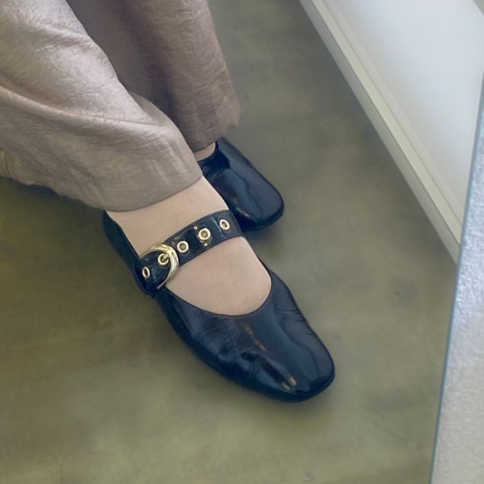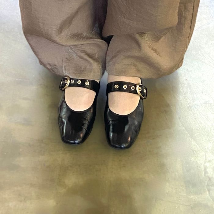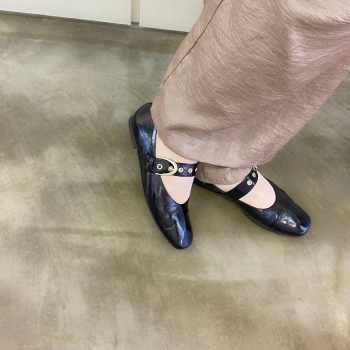 光沢感のあるブラックのパテントレザーが、足元に上品な存在感をプラス。