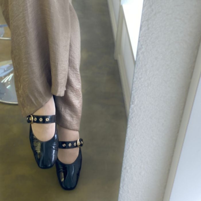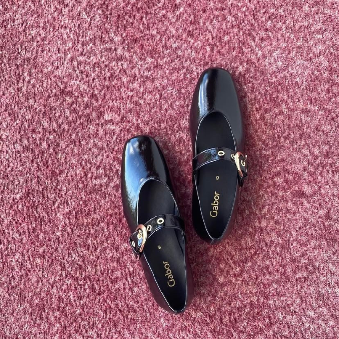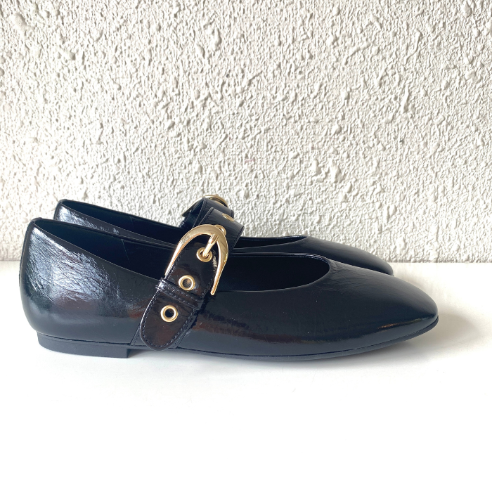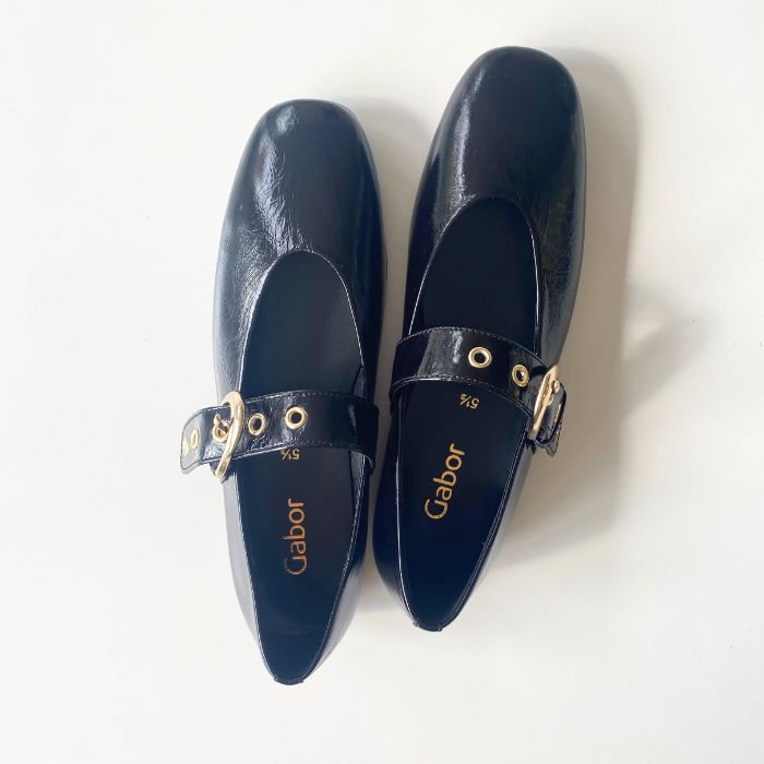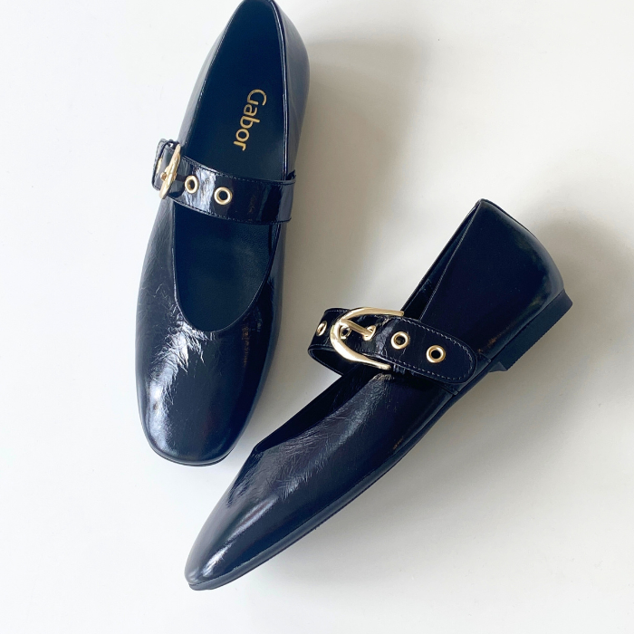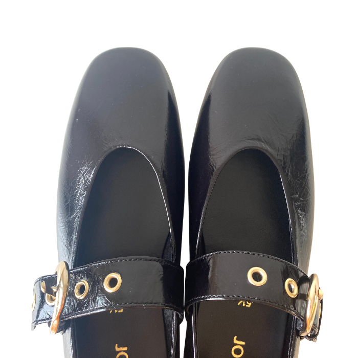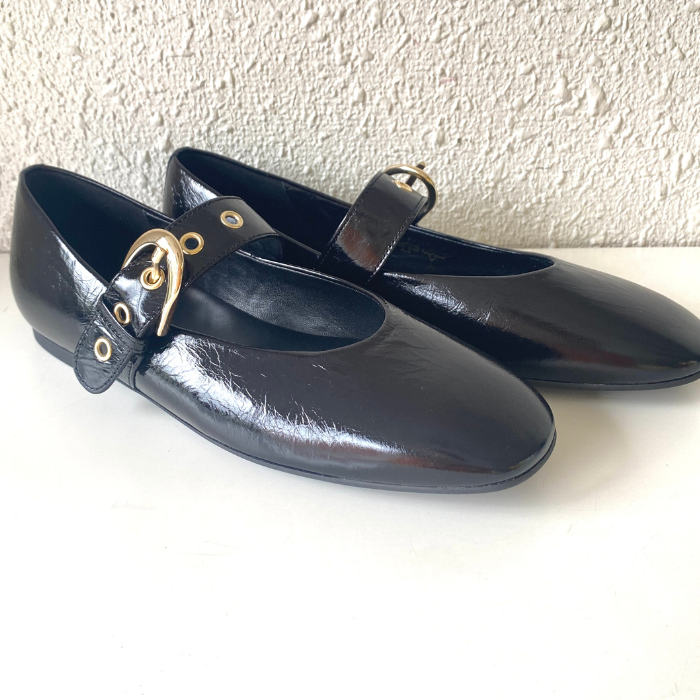 光沢感のあるブラックのパテントレザーが、足元に上品な存在感をプラス。