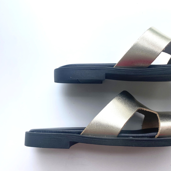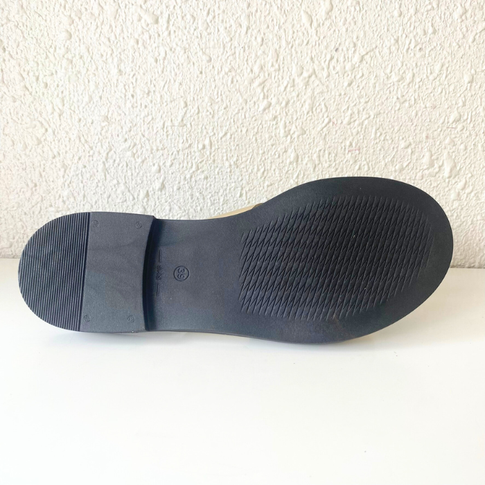 ゴールドレザーとブラックソールのコントラストが、上品さとモード感を両立させてくれます。